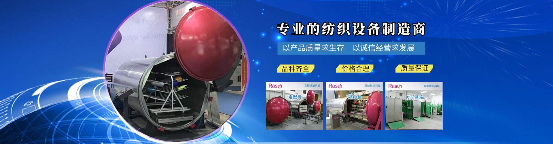 江蘇日新紡織科技有限公司是一家集科研、開發、生產、銷售、服務為一體專業設計制造蒸紗機,蒸紗鍋,蒸箱,定型機,襪子定型機,紗線定型機的的廠家,蒸紗機生產設備精良,蒸紗鍋設計工藝 ,蒸箱檢測手段齊全,紗線定型機技術雄厚,高品質的蒸箱,蒸紗鍋,蒸紗機,紗線定型機產品,在國內外享有盛譽。公司坐落于江蘇省金湖縣建設西路413號,處于南京、揚州、淮安一小時都市經濟圈。公司本著“誠信之本”的經營理念,在中國及全球地區不斷開拓新市場,熱誠與社會各界有識之士合作,構成一個良好的營銷體系。為您提供專業的一條龍服務。愿江蘇日新人能感染您,推動您,走入永遠屬于我們的天空中去。 + MORE